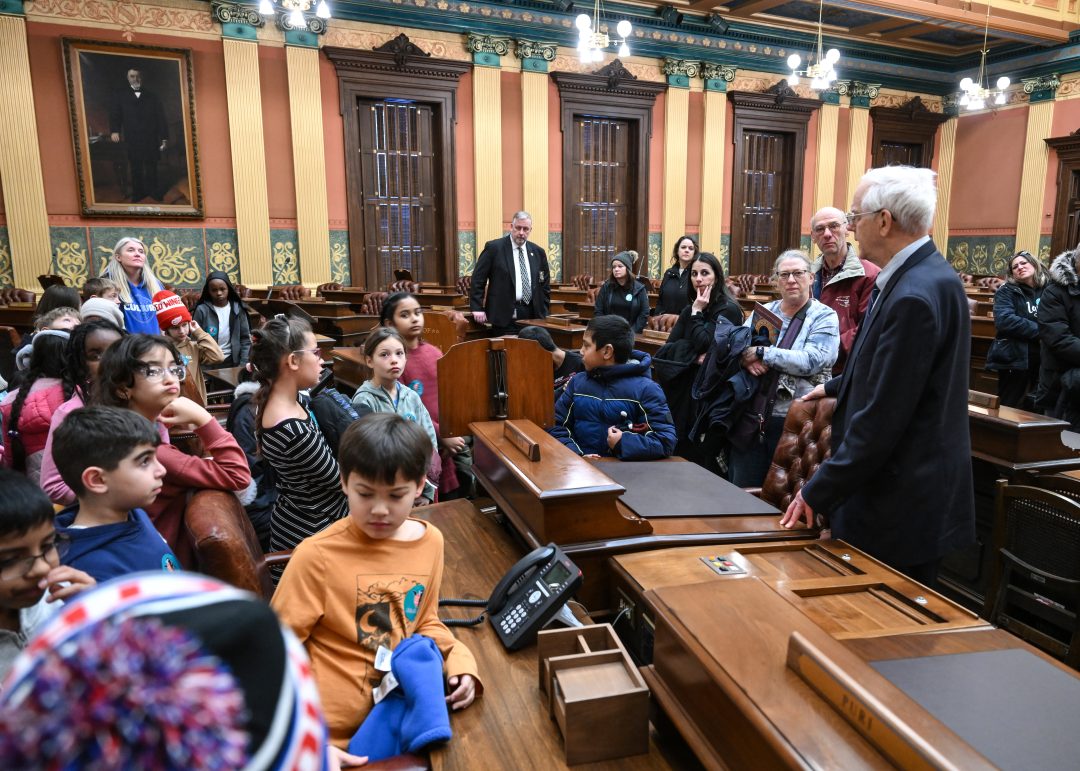State Rep. Tom Kuhn (R-Troy) today welcomed two fourth-grade student groups and faculty from Troy Union Elementary School to the Capitol. The group toured the Capitol building and met with Kuhn to discuss the legislative process. The visit included about 70 students and 20 parents who participated in the tour.
